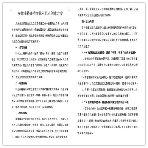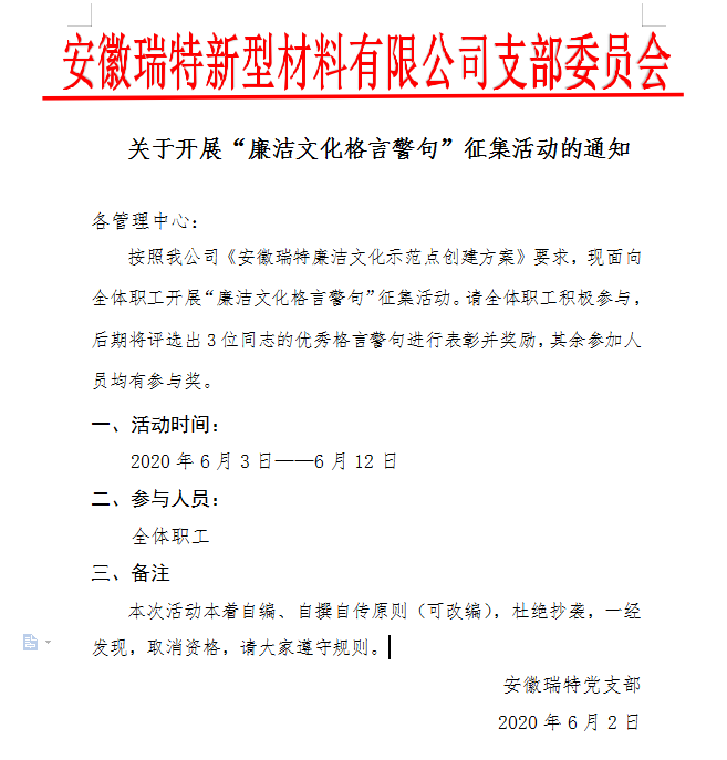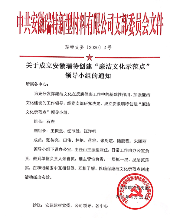 為進一步規(guī)范生產經營管理,強化廉潔意識,充分發(fā)揮企業(yè)文化在公司發(fā)展中的引領作用。安徽瑞特依據2020年度目標任務,結合生產經營特點,自今年4月中旬以來,扎實開展了 “廉潔文化示范點”創(chuàng)建工作。