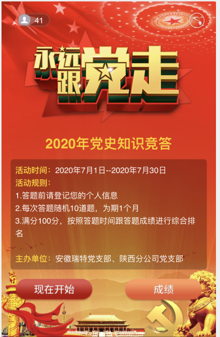 遙憶輝煌史詩,禮贊初心不渝--安徽瑞特黨支部聯(lián)合陜西分公司黨支部開展黨史知識微信競答活動