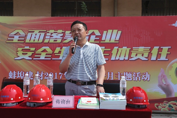 考核組一行到達(dá)蚌埠建材后,首先開展了“安全生產(chǎn)月”咨詢?nèi)栈顒?。徐總對“全面落實企業(yè)安全生產(chǎn)主體責(zé)任”及安全生產(chǎn)的重要性進(jìn)行了解讀并現(xiàn)場發(fā)放安全知識宣傳手冊。隨后,在蚌埠建材相關(guān)領(lǐng)導(dǎo)陪同下,對整個生產(chǎn)廠區(qū)進(jìn)行全面安全檢查。