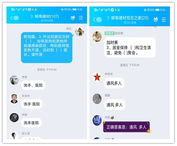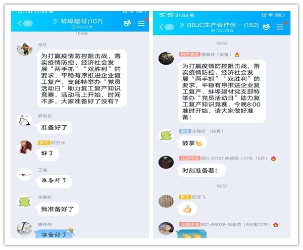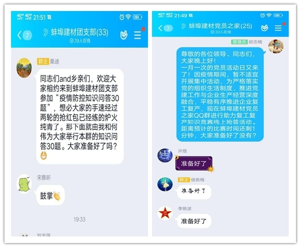 `活動(dòng)于3月13日晚上7點(diǎn)30分,率先以小規(guī)模答題模式在蚌埠建材團(tuán)支部QQ群(33人)進(jìn)行;并于晚上8點(diǎn)整,同時(shí)在蚌埠建材黨員之家QQ群(25人)、蚌埠建材QQ群(107人)、BBJC生產(chǎn)合作伙伴QQ群(182人),進(jìn)行全面開花式線上搶答活動(dòng)。